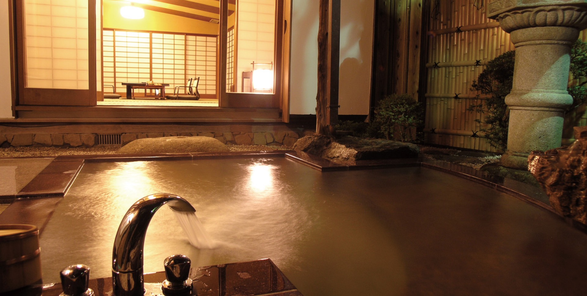 緑の庭木に鳥がさえずり、庭石の間のせせらぎを間近に聞きながらゆったりした時間が流れる庭の美しいお部屋です。灯籠や庭木に囲まれた専用露天風呂も風情ある情緒で旅の楽しみを高めます。