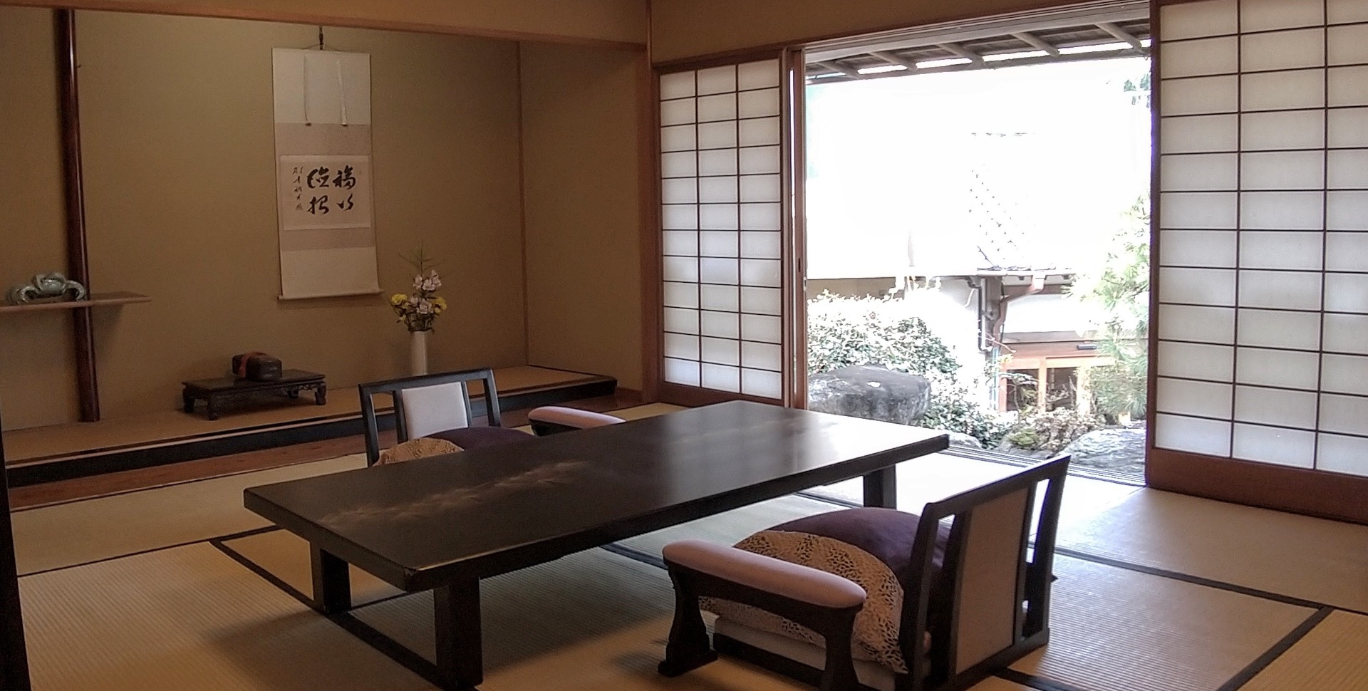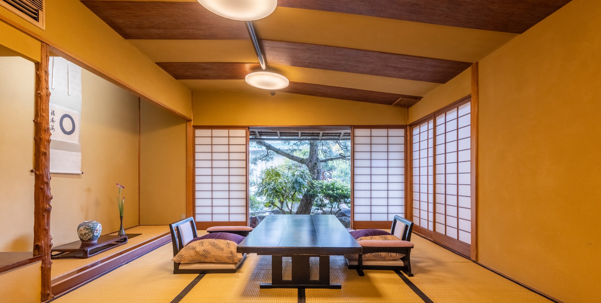 見晴らしの良い景観が望め、ゆったりとした二間続きのお部屋には清々しい風が通り抜けます。奥の庭には専用の露天風呂に滾々と湯が溢れ、プライベートなくつろぎを自適にお楽しみいただけます。